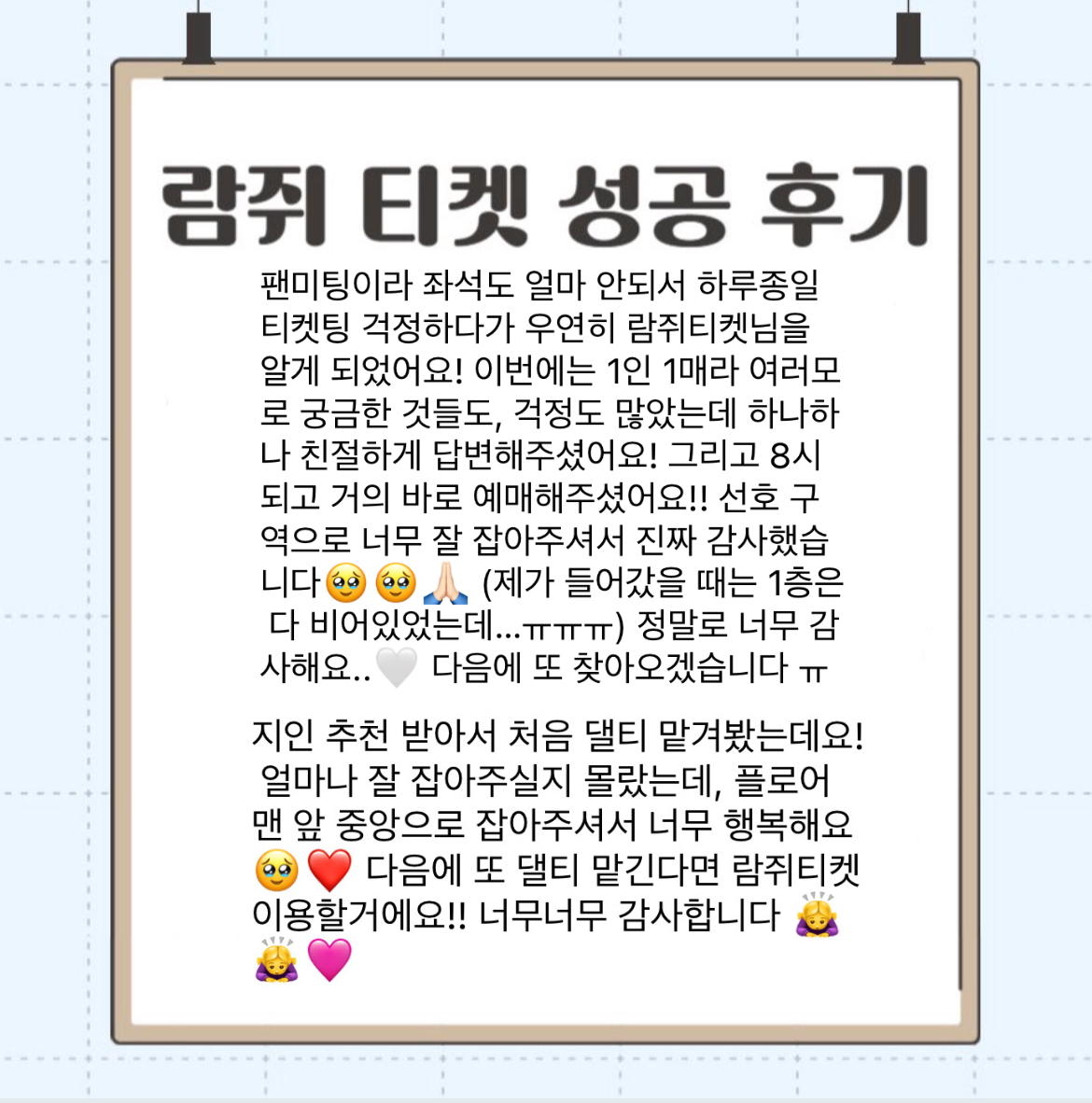 카테고리 없음 𝟮𝟬𝟮𝟱 𝙄𝙐 𝙁𝘼𝙉 𝙈𝙀𝙀𝙏-𝙐𝙋 [𝘽𝙮𝙚, 𝙎𝙪𝙢𝙢𝙚𝙧] 아이유 팬미팅 대리티켓팅 성공경력 알 수 없는 사용자 2025. 8. 11. 21:51 아이유 팬미팅 대리티켓팅 전원 성공했습니다🌷엔위시 엔하이픈 스우파 댈티 모집중이니 편하게 문의주세요카톡채널 문의 pf.kakao.com/_YPrYG 🤲🏻️ 공유하기 게시글 관리 람쥐티켓️