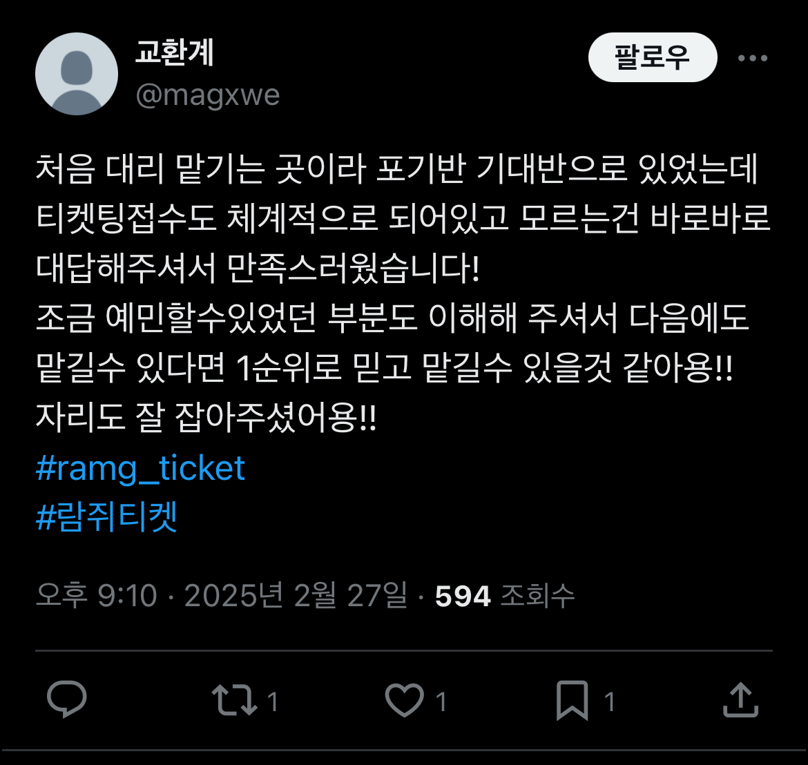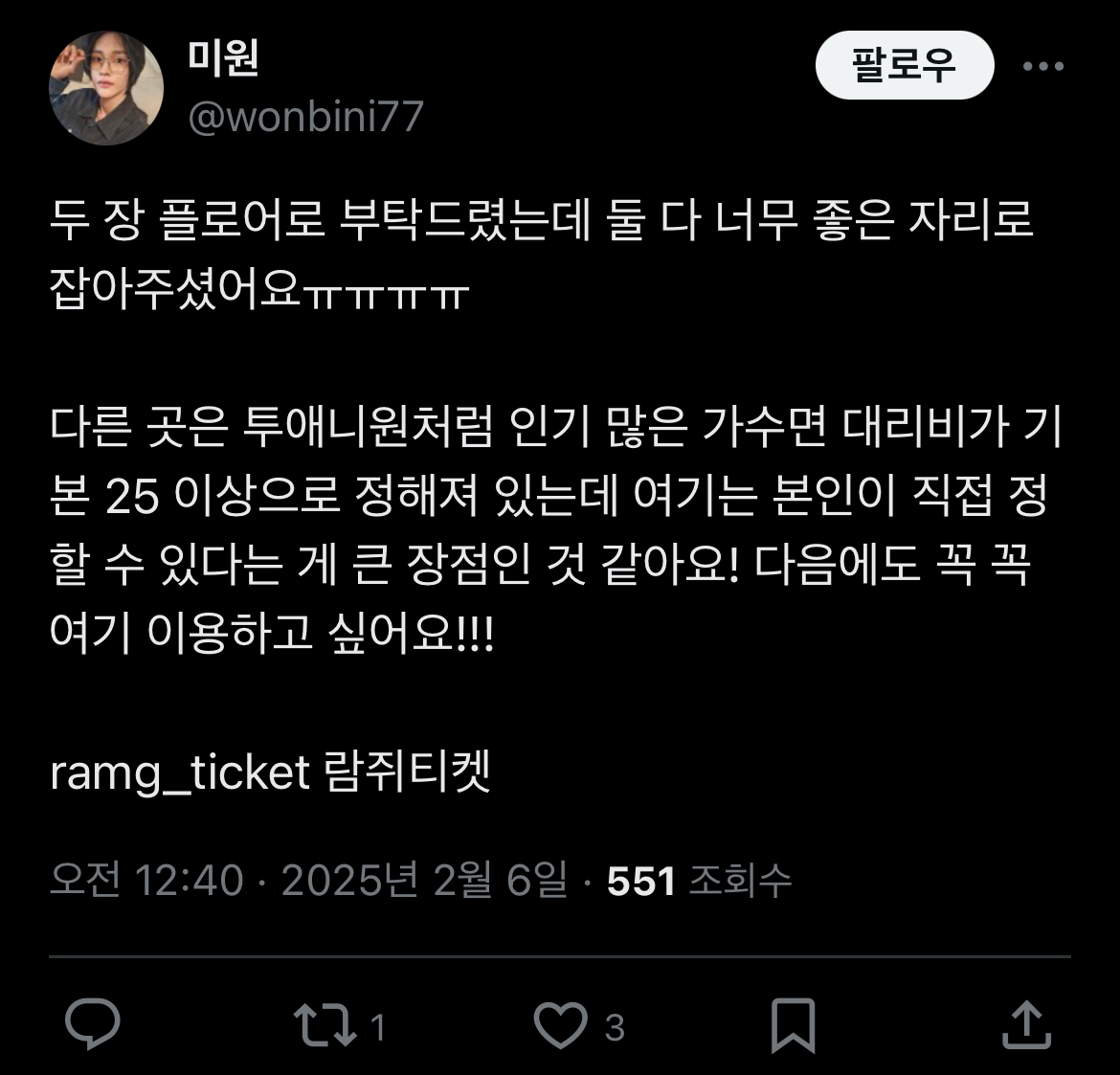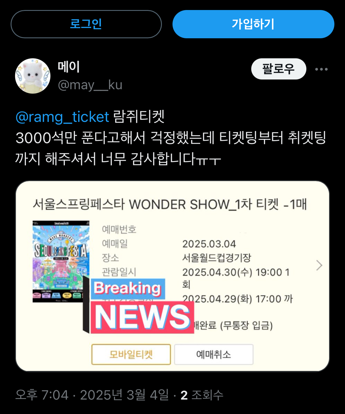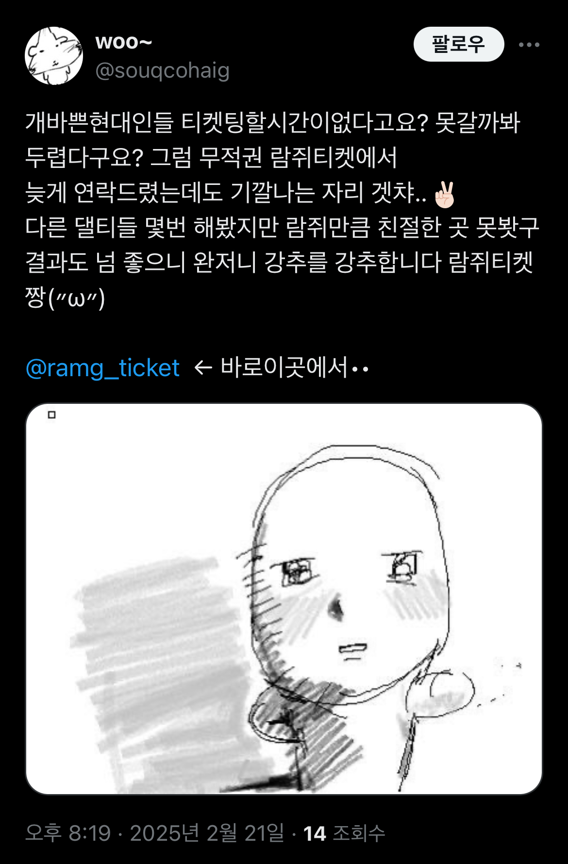 트위터후기 2025 트위터 후기 알 수 없는 사용자 2025. 1. 15. 22:37 람쥐티켓의 대리티켓팅 트위터 후기모음입니다🐿️ 계속 업데이트 됩니다✨ 공유하기 게시글 관리 람쥐티켓️