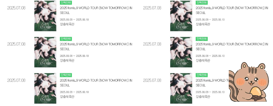 카테고리 없음 2025 fromis_9 WORLD TOUR 〈NOW TOMORROW.〉 IN SEOUL 프로미스나인 대리티켓팅 성공경력 알 수 없는 사용자 2025. 7. 8. 21:19 🤍프로미스나인 대리티켓팅 선예매 성공 일반예매도 마지막으로 모집합니다🤍 상담 pf.kakao.com/_YPrYG ❤️🔥 공유하기 게시글 관리 람쥐티켓️