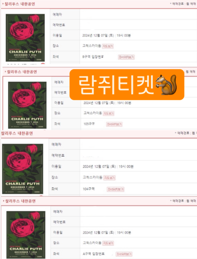 카테고리 없음 《Charlie Puth Presents “Something New” in Seoul》 2024 찰리푸스 내한공연 대리티켓팅 성공경력 ramg_ticket 2024. 10. 16. 14:46 찰리푸스 아티스트 선예매 성공했습니다 !! 라이브네이션 선예매도 신청받고있으니문의주세요🍀http://pf.kakao.com/_YPrYG 일반예매도 모두 성공했습니다 💪🏻💪🏻